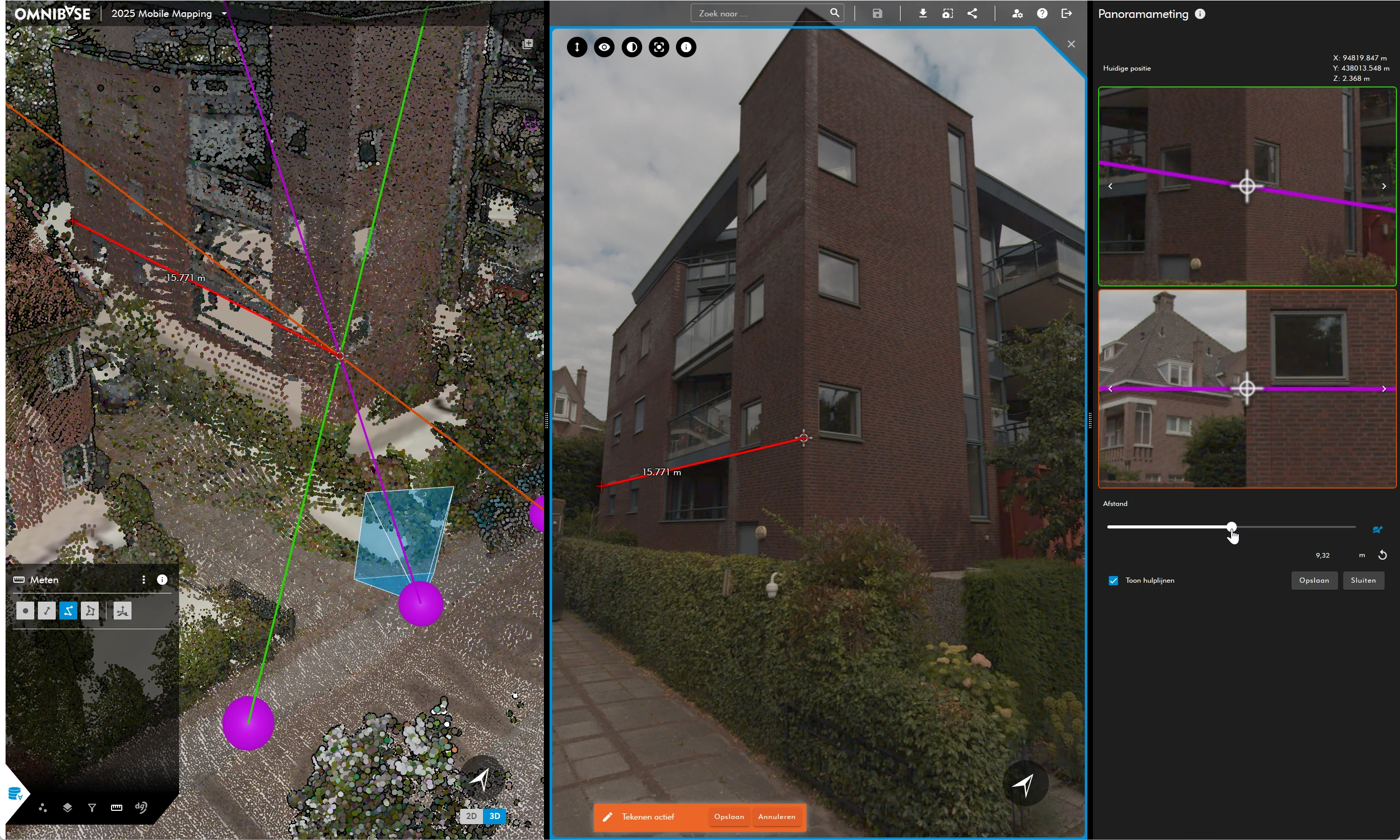 Het meten in panoramafoto's werkt met dezelfde techniek als de luchtfotometing. Het grote verschil is dat bij een panoramafotometing de hulplijnen van de twee zij-beelden kunnen worden getoond, waarmee in de 3D-view gemakkelijk kan worden bekeken of het meetpunt aansluit op puntenwolk-referentiedata.