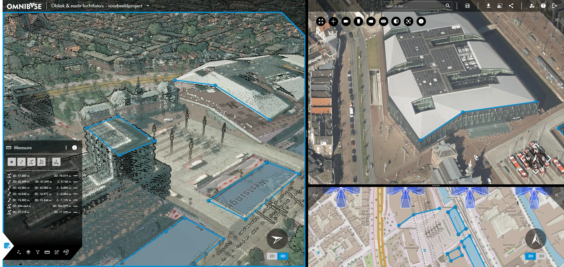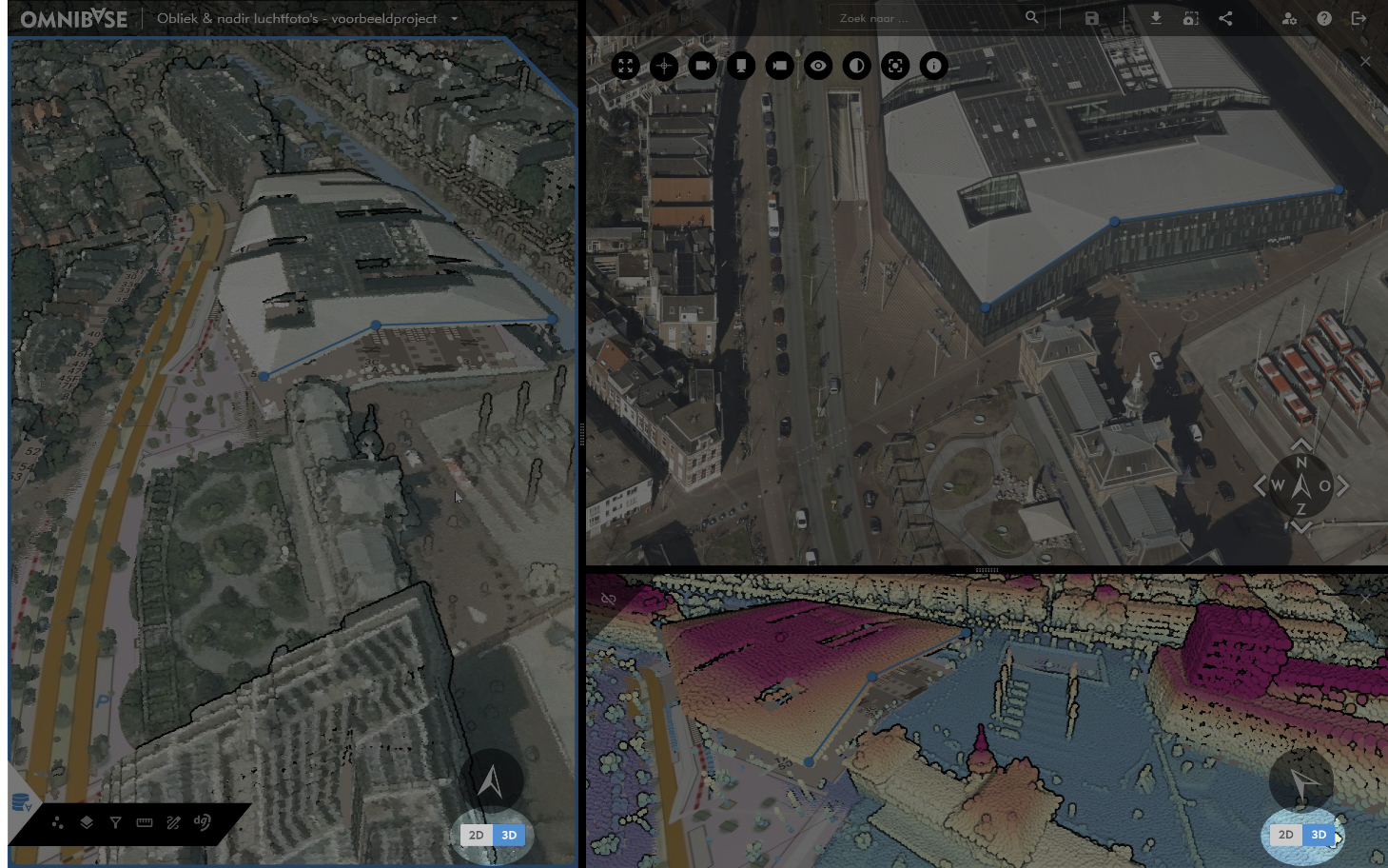 Binnen de 3D-modus van Omnibase komt alle data bij elkaar. Er kan gemakkelijk worden gepand, geroteerd en gezoomd tot het benodigde detailniveau. Metingen zijn real-time in alle databronnen (verschillende schermen) zichtbaar. Hiermee kan een luchtfoto- of panoramafoto-meting makkelijk gecontroleerd worden in de 3D-weergave.