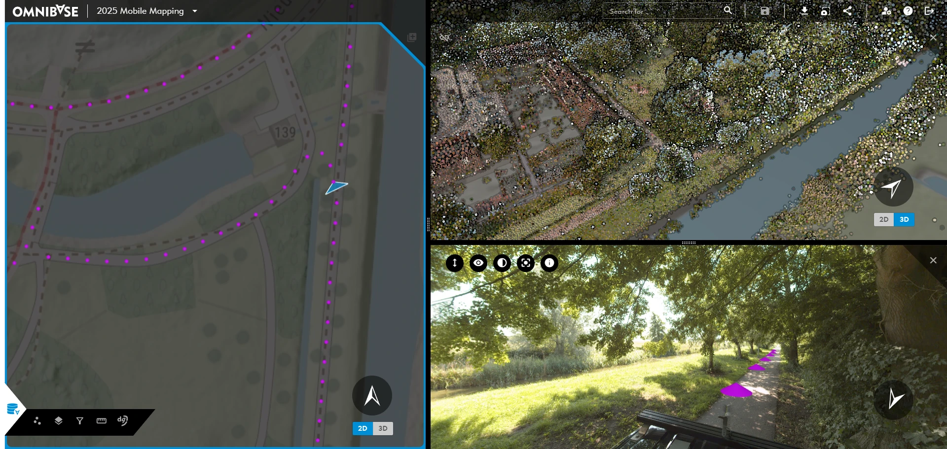 In het linker scherm is de kaartmodus 2D en kan worden gekozen om alleen de basiskaart (transparant) weer te geven samen met de panoramafoto-locaties. Het rechter bovenscherm - wat in dit geval niet gelinkt is aan het linker scherm - is in 3D-modus waardoor je de puntenwolk in driedimensionale weergave ziet.