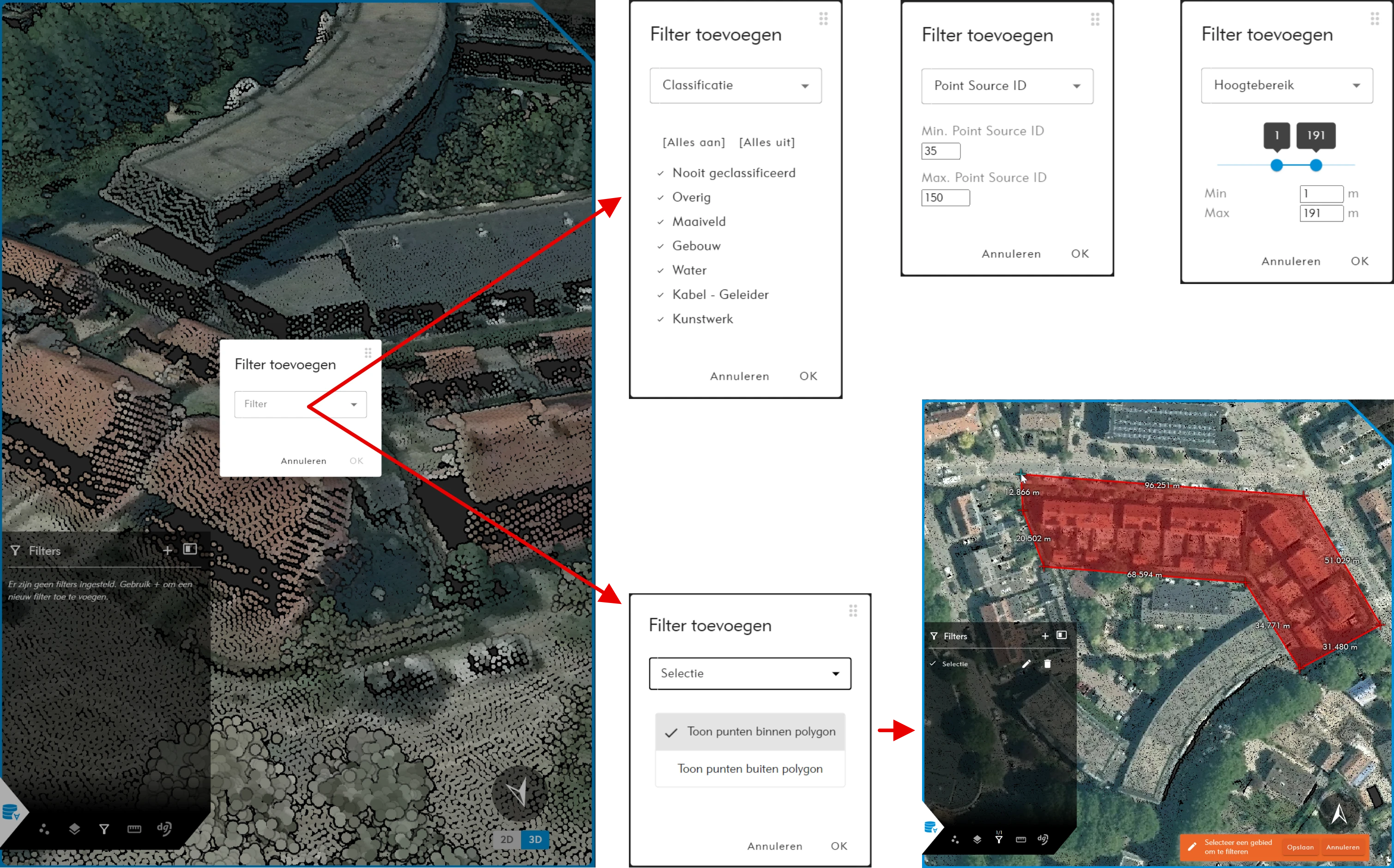Voorbeeld instellen van alle filteropties uit drop-down list: Classificatie, Point Source ID en Hoogtebereik (alle drie de opties rechtsboven). Voorbeeld toevoegen selectie-filter met tweede menu-optie tonen punten binnen of buiten de filter (rechtsonder).