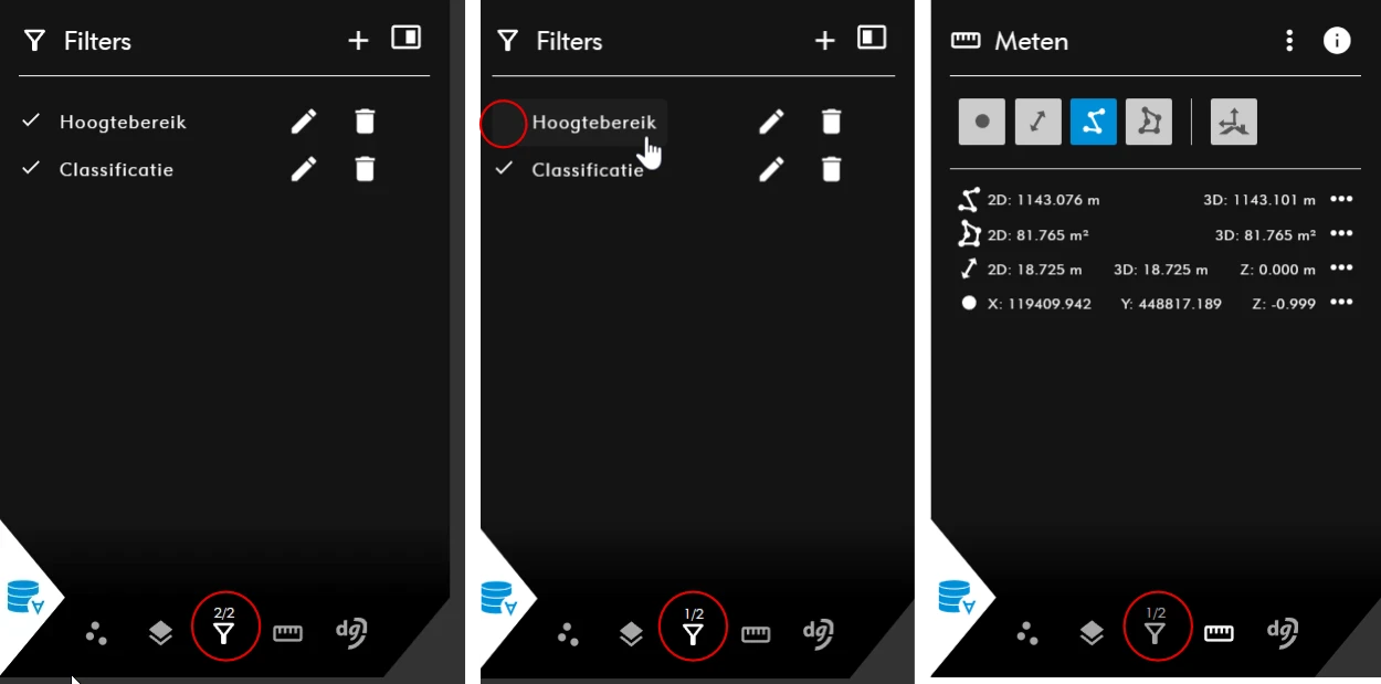 Filtermenu (links) met twee ingestelde filters. Het middelste figuur toont een (tijdelijk) uitgeschakelde hoogtebereik-filter en de rechter figuur toont het geopende meetmenu met de informatie dat 1 van de twee filters nog actief is.