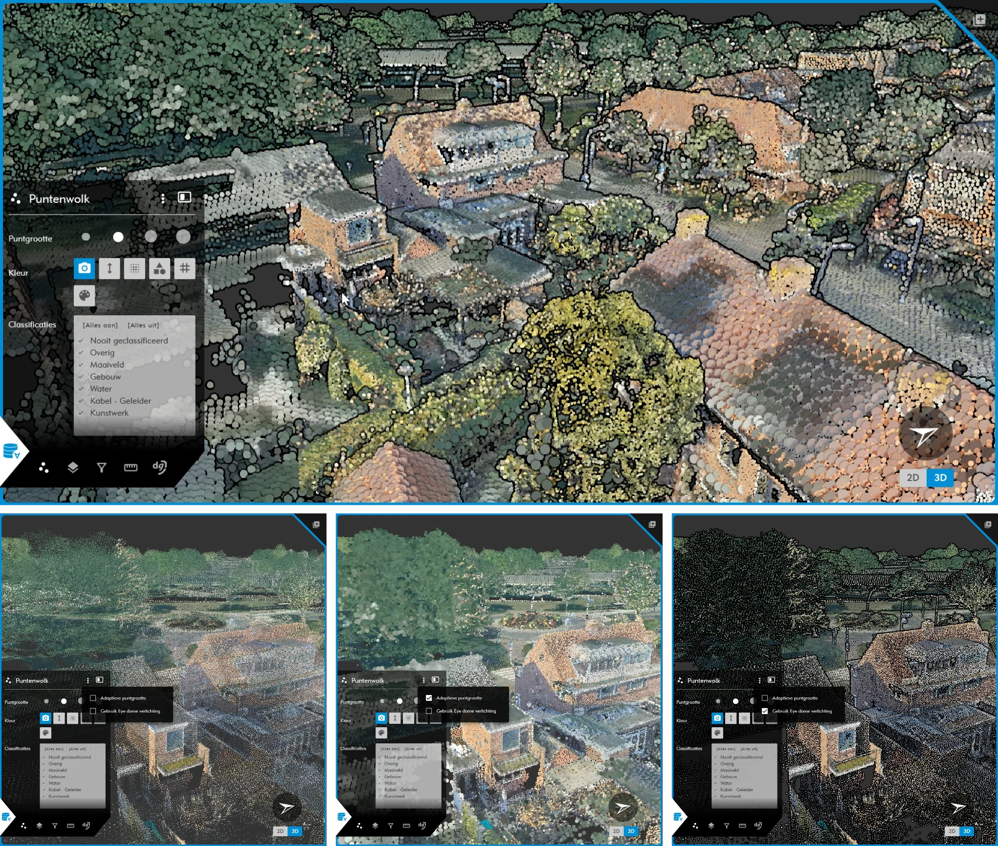 Voorbeeld met alle geavanceerde puntenwolk visualisatie-instellingen aangezet (boven), geen geavanceerde instellingen aangezet (linksonder), alleen adaptieve puntgrootte (midden onder) en alleen Eye-Dome lighting (rechtsonder).