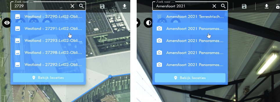 Binnen Omnibase kan je naar verschillende soorten gegeven zoeken om locaties, foto's of andere objecten te vinden. Dit wordt gedaan in het Zoeken naar-veld rechts bovenin de viewer.