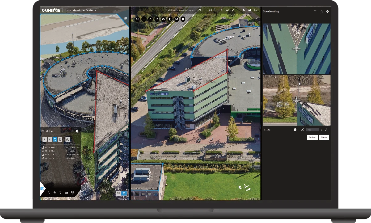 Every dataset has its advantages. In Omnibase, you don't have to choose between oblique photos, nadir photos, panoramic images, 3D-models, or point clouds. Combine all datasets within one measurement. Start in a point cloud, continue in an oblique image, and complete your measurement in a panoramic image: measurements are displayed live in all open (split)screens.