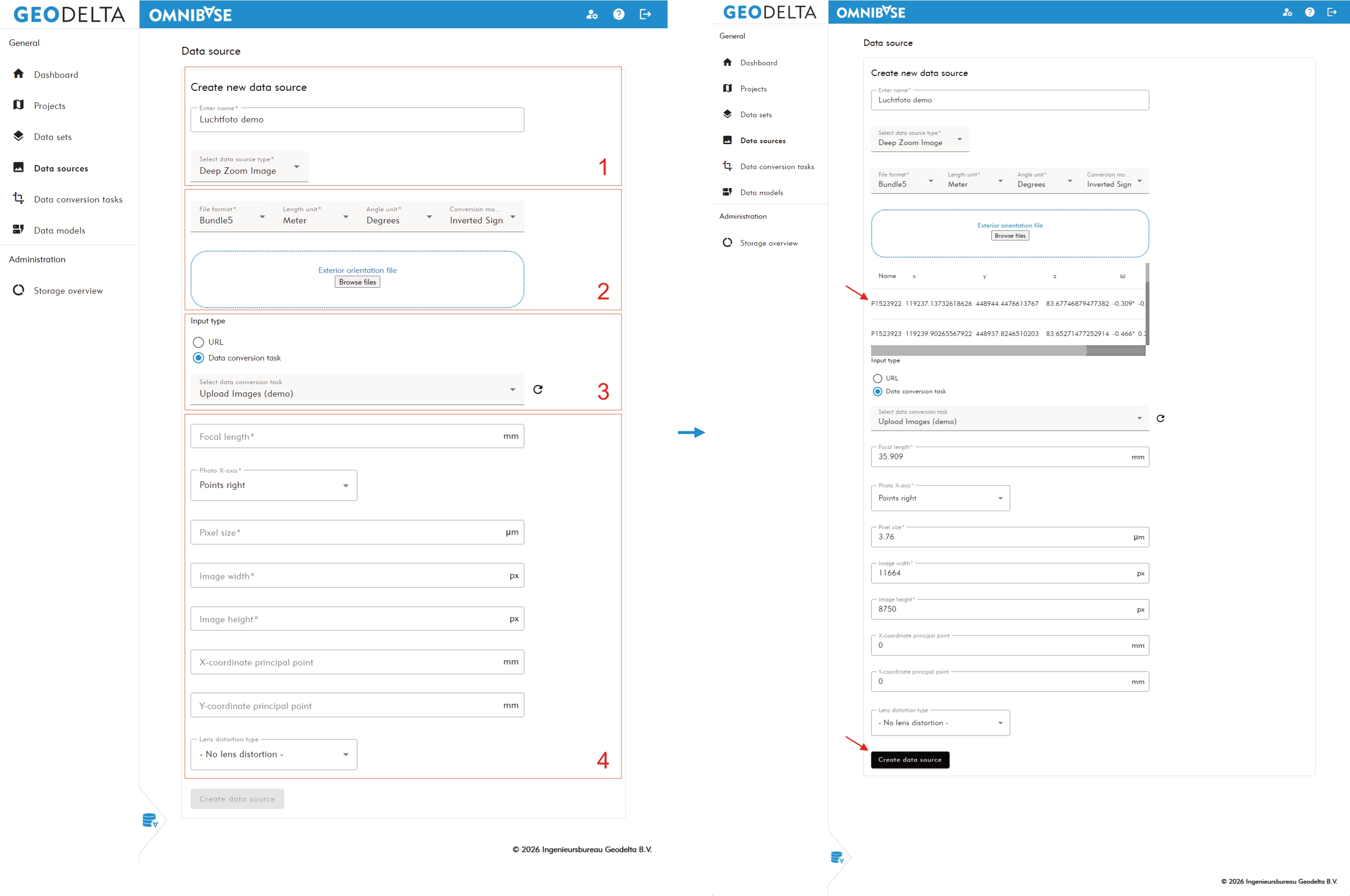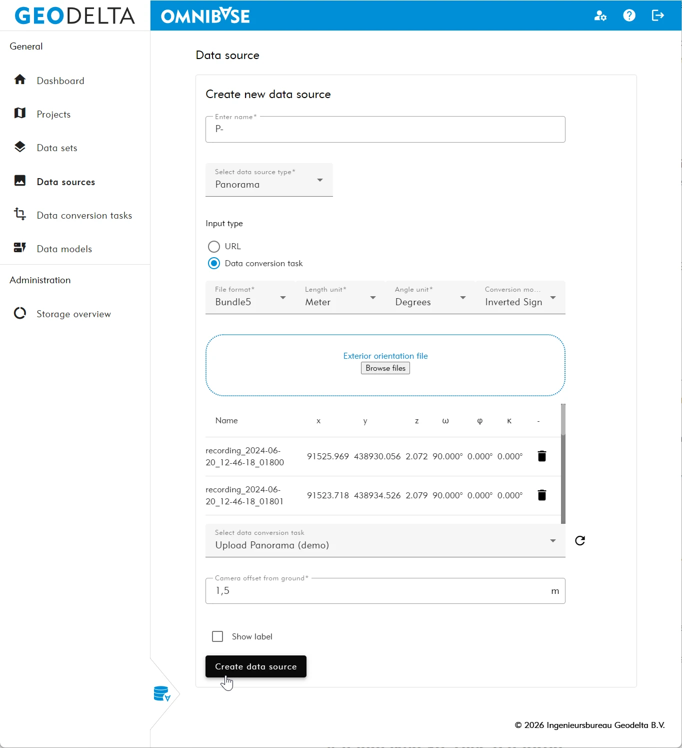 Within the data sources menu, data sources are created from data conversion tasks. A file is linked to additional metadata so it can be visualized in the viewer.