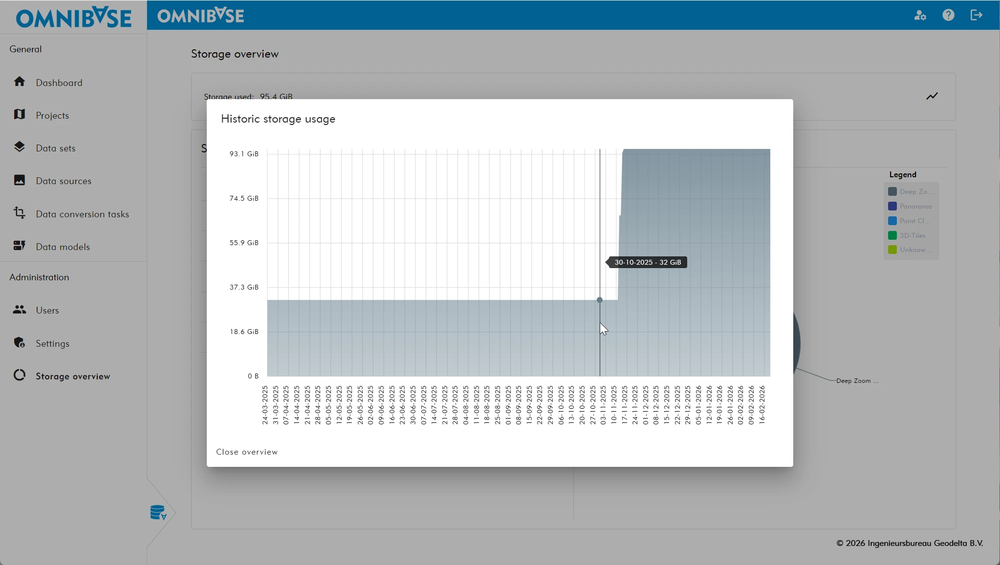The historical graph represents the cumulative total of all data uploaded and converted via data conversion tasks in Omnibase. By comparing the date of total storage growth with the date of a specific data conversion task, it is possible to determine when a particular dataset was added.