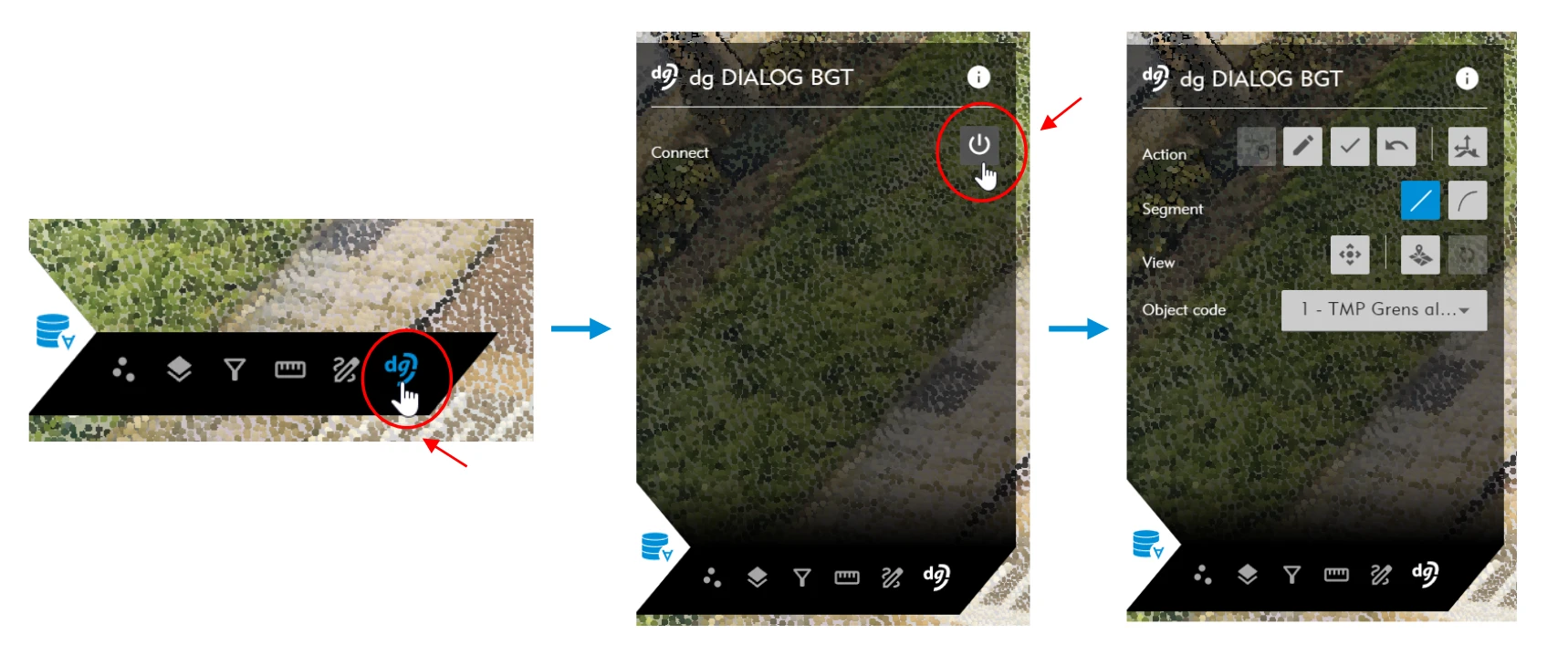 Next, open a project in which you want to use the integration and click the dg DIALOG BGT icon in the integrations menu within the viewer. This opens the integration menu and a connection can be established by pressing the connect button.