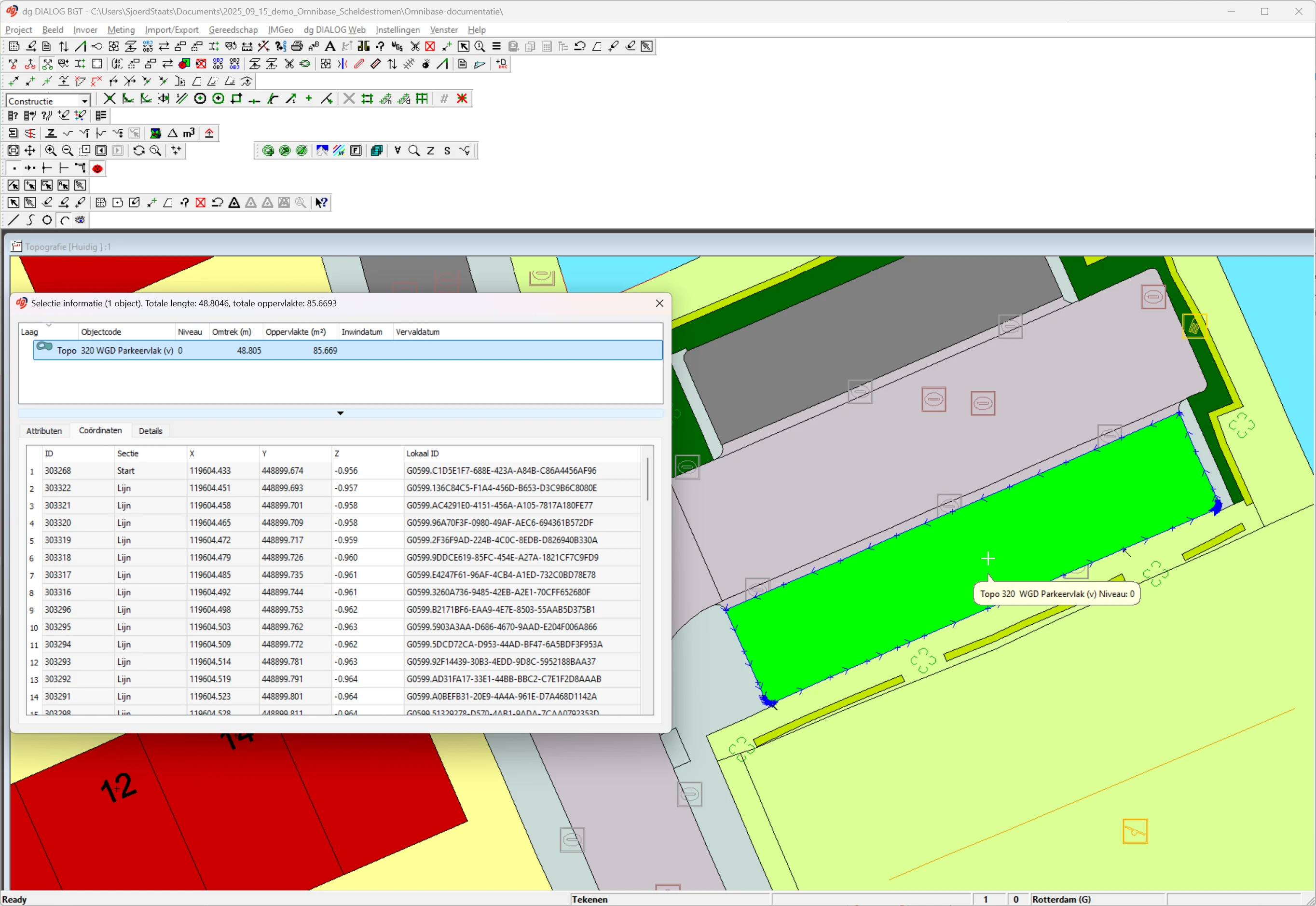 The principles of the integration are that measurements from Omnibase are directly and very easily mapped to the correct object code layer within dg DIALOG BGT. This makes the measurements immediately usable within the BGT management application and eliminates the need for further adjustments. In addition, the acquisition method per measurement point (vertex) is stored as metadata. It does not matter whether a measurement is performed using a point cloud, panorama photo, or aerial photo: within dg DIALOG BGT, all these metadata attributes are accurately stored.
