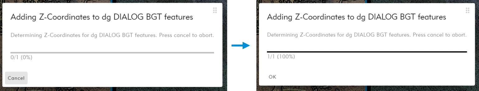 To automatically determine Z-values: select one or more objects in dg DIALOG BGT and click the ‘ Z ’ next to the magnifier icon within the interfaces menu. dg DIALOG BGT will display the message “Request for Z-values sent to Omnibase.”