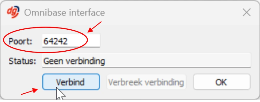 Enter a free port number (choose the default option provided by dg DIALOG BGT, e.g. 64242). This must be the same port number configured in Omnibase. Click the Connect button and the following information will be shown.