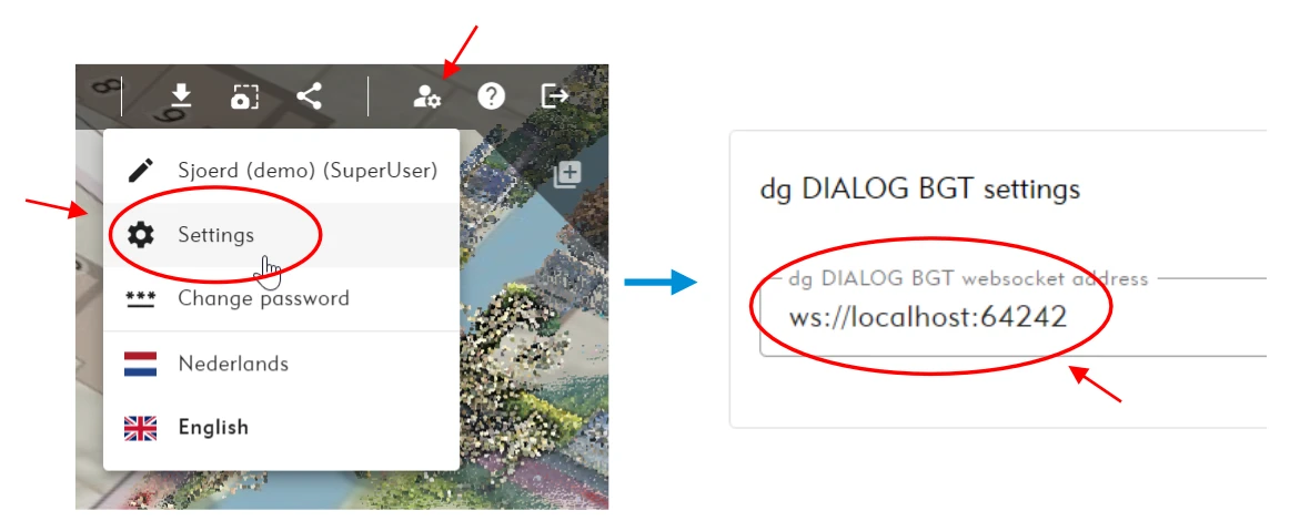 Now switch to Omnibase and, only on first use, verify that the port number in the websocket address matches the port number in dg DIALOG BGT. The websocket address should be as follows: ws://localhost:64242.