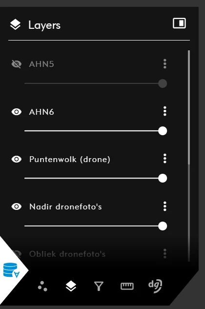 Viewer settings are always available at the bottom left of the left screen and apply to the open project. Within a project, datasets, optional vector reference layers, annotation data models, and a basemap are defined. Depending on the available datasets or modules (such as annotations), specific menu components are activated.